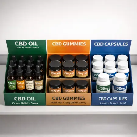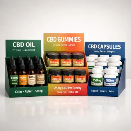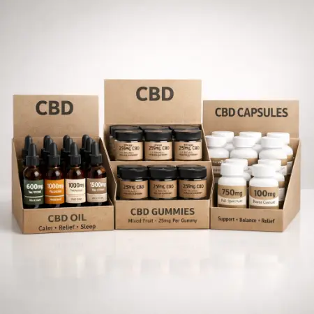 These display boxes for CBD are specialized packaging designed to visually showcase and organize CBD products at retail points of sale and they also combine presentation and function, helping brands attract attention, drive sales and maintain product order on shelves or countertops.