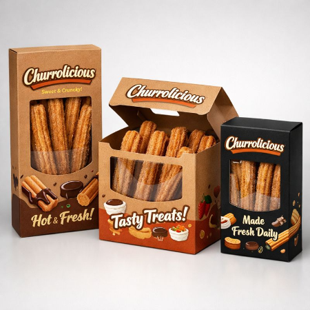 These custom boxes are the personalized packaging solutions designed to hold and showcase churros, offering branding opportunities and improving the overall presentation of the treat. These boxes can be customized with various options including materials, sizes, shapes, printing and closures, to create unique and appealing packaging experience for customers.
