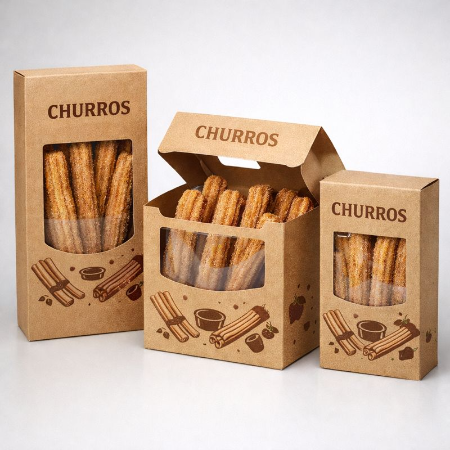Our custom boxes are designed to improve your product presentation while ensuring maximum freshness and convenience, with features like grease-resistant lining, options dip compartments and ventilation to keep churros crispy, also our boxes are both practical and visually appealing, we offer full customizable designs to showcase your brand, attract attention and create a memorable customer experience, being made from ecofriendly materials and built for portability, other benefits of our boxes are: