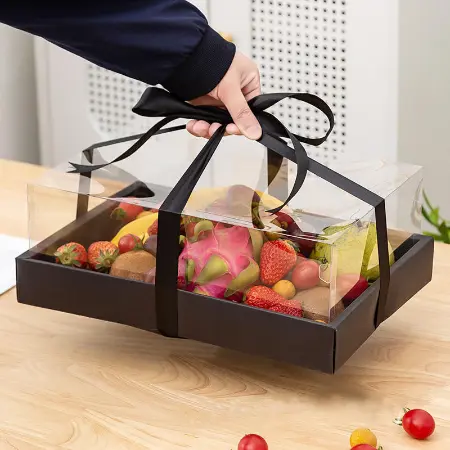 As the name implies, a specialized container that features a black base with a transparent lid on top for clear visibility of contained items. Commonly made from cardboard or kraft paper material, and is ideal for multiple items for storing, presentation, and holding.