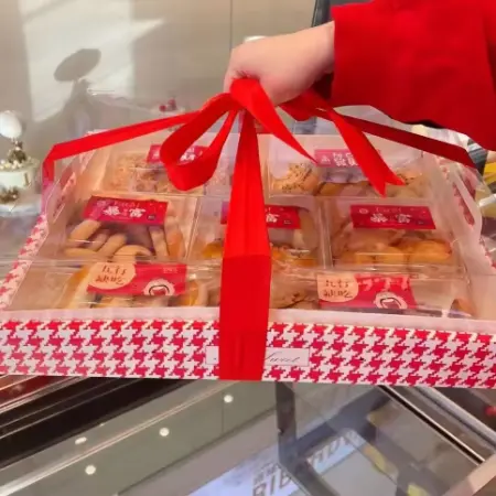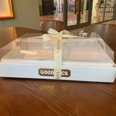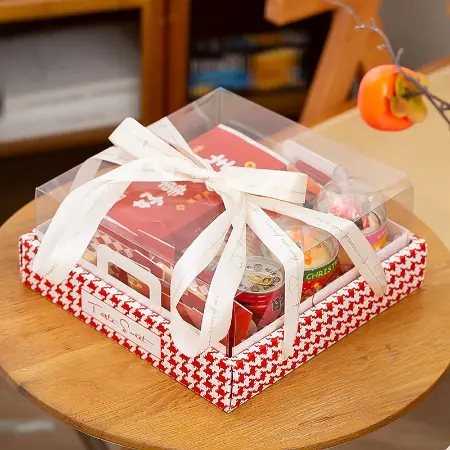 A specialized gift set featuring a transparent top lid, allowing the visibility of the contained item while wrapped. Commonly made from foldable cardboard, rigid to make an ideal present in retail display, gift-giving, or presentation.