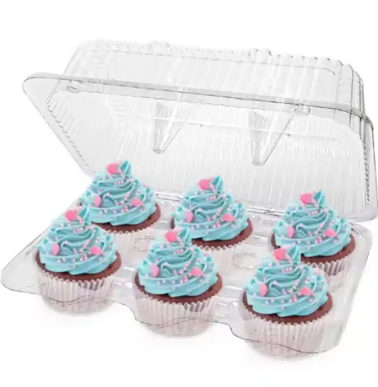 Refers to a specialized container that is designed to hold and protect cupcakes, featuring hinged flaps on one side that open and close like a clamshell. Commonly made from clear plastic that showcases the creation attractively while being wrapped.
