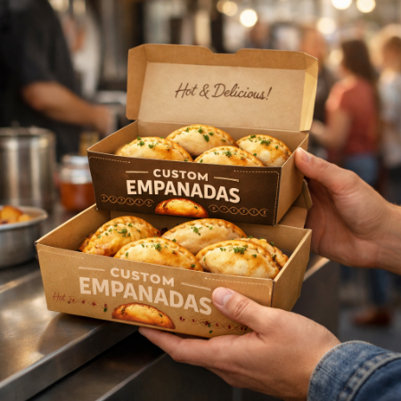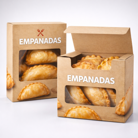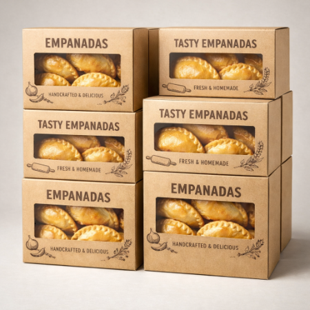 These boxes are the specialised containers designed to hold and transport empanadas, a type of baked or fried pastry, and are typically made from food-grade materials like cardboard or paperboard, ensuring the empanadas remain fresh and protected during storage and delivery, these boxes often feature custom designs, including branding elements like logos and colors, to improve the products presentation and appeal.