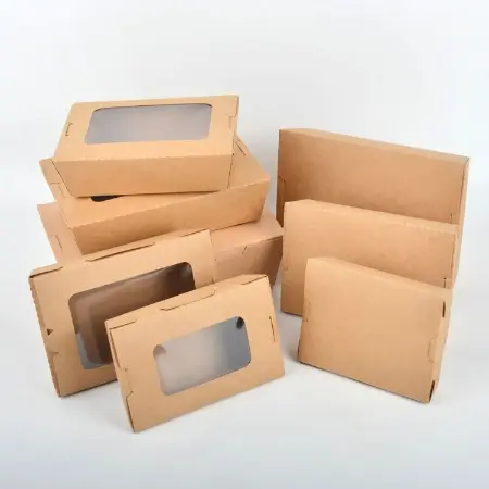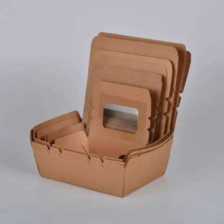 These packaging boxes are sturdy, often eco-friendly packaging options made from kraft paper, designed to hold and transport baked goods and are typically known for their durability, resistance to tearing, and ability to keep baked goods fresh and are popular choice for bakeries and food businesses due to their functionality and often natural rustic appearance.