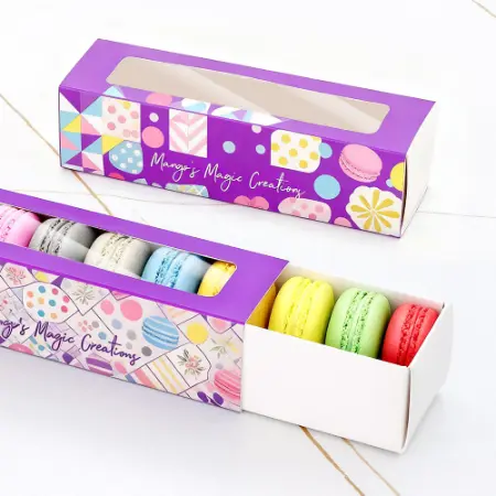 These are the specialized packaging boxes or containers designed to hold and protect delicate macarons, often featuring clear windows for display and inserts to keep the cookies separated and are used by bakeries caterers, and individuals for gifting , storage and shipping and als act as a marketing tools to make your brand more visible.